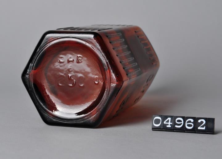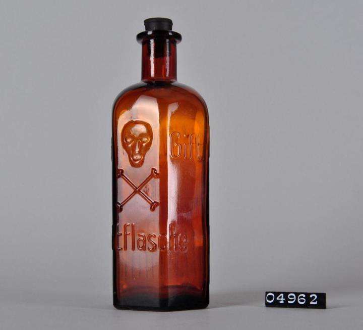 Bernsteinfarbige Sechskantflasche aus Glas mit Totenkopfsymbol und darunter gekreuzte Knochen. Verstärkter Mündungsrand. Innerhalb der Glasstruktur links und rechts neben Totenkopf das Wort "Gift". Unter dem Totenkopf und den gekreuzten Knochen und der Prägung "Giftflasche". An drei Seitenteilen ist das obere und untere Drittel geriffelt. Im mittleren Drittel Platz für das Etikett. Nach oben gewölber Boden mit Prägung "DAB 250". Mit schwarzem Gummistopfen verschlossen. Üblicherweise zur Abgabe von Salzsäure, Salmiakgeist, Lysol und Sublimatlösung verwendet.