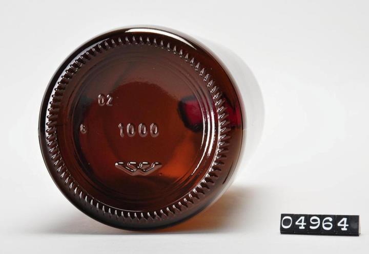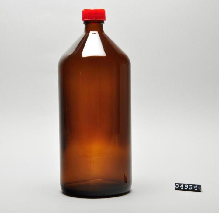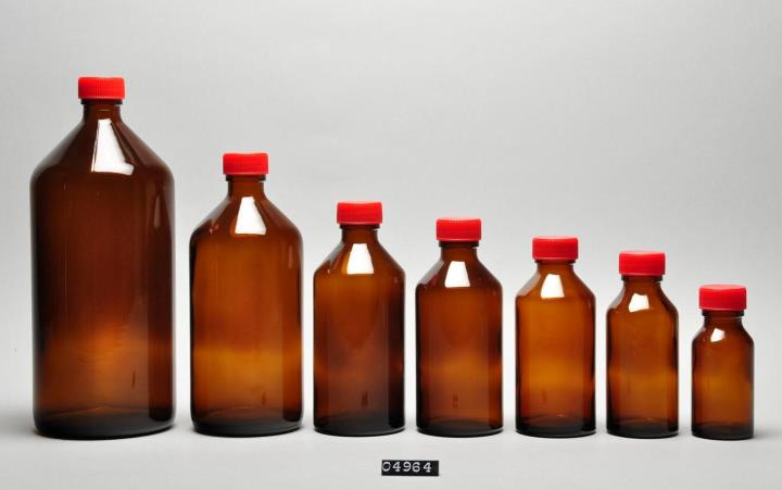 Runde, braune, zylinderförmige Natronkalk-Silikatglasflasche mit Tropfring aus Silikon und rotem Schraubverschluss aus Polypropylen (PP) und Dichtung aus PE-LD (LDPE). Boden leicht nach oben gewölbt, Rand geriffelt. Bodenprägung. Serie mit sieben verschiedenen Größen: 1000, 500, 250, 200, 150, 100 und zu 50 Milliliter.