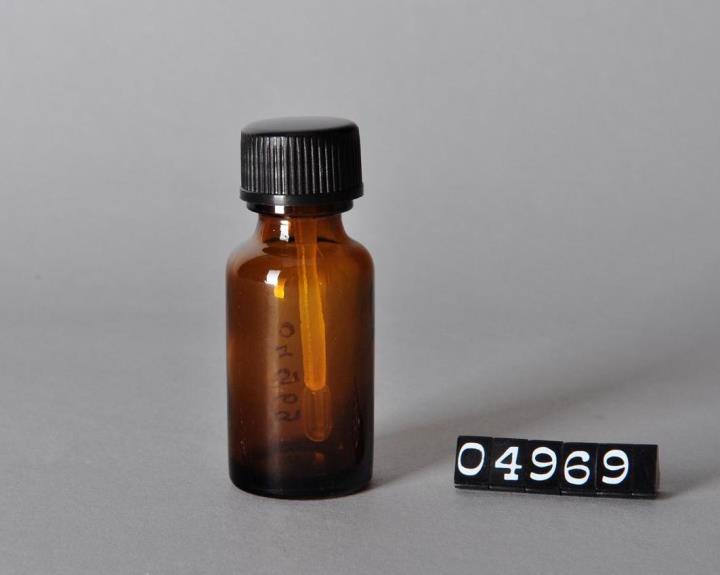 Brauner, zylindrischer Flaschenkörper, verstärkter Mündungsrand mit Schraubgewinde. Schwarzer Kunststoffverschluss mit Spatel aus Poliethylen. Bodenrand geriffelt. Mit Prägung der Volumenangabe 10ml.