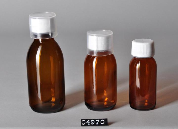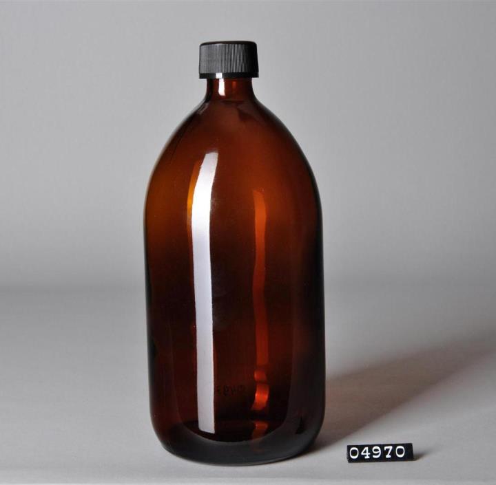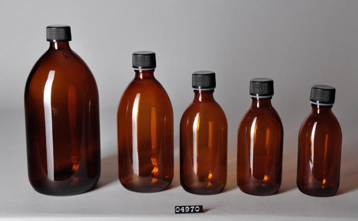 Brauner, zylindrischer Flaschenkörper mit abfallender Schulter und Seitennaht. Mündung verstärkt und Schraubgewinde. Sicherheitsverschluss mit Dichtung aus PE-LD (LDPE). Fünf Flaschen mit schwarzem Schraubverschluss zu 1000, 500, 300, 250, 200ml . Drei Flaschen mit weißem Schraubverschluss und Dosierbecher zu 150, 100 und 50ml. Volumenangabe und Punkte, welche auf das Herstellungsdatum verweisen, seitlich aufgeprägt. Bodenrand geriffelt.