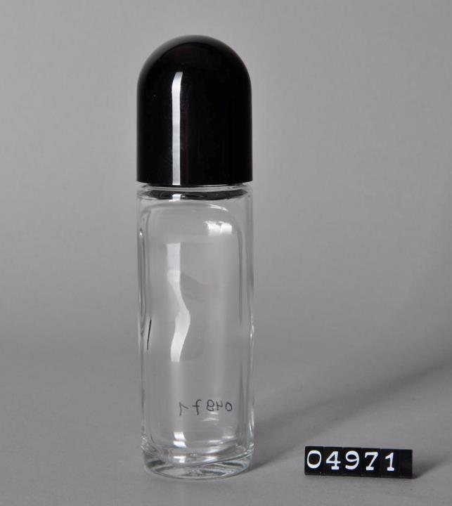 Zylindrischer, beidseitig abgeflachter, farbloser Flaschenkörper. Mündung mit Gewinde und kugelförmigem Kunststoffeinsatz (Roll-On). Schwarzer Schraubverschluss aus Kunststoff. Leicht nach innen gewölbter Boden mit geriffeltem Standring und Bodenprägung.