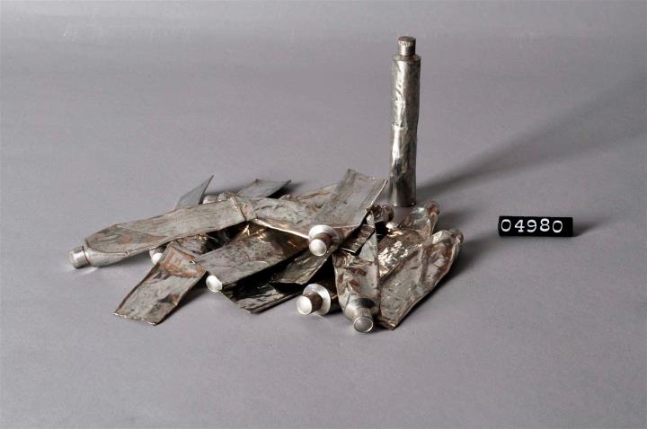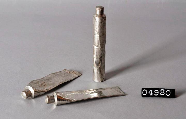 Zylindrischer Körper aus Stanniol (Zinn) mit Zinn-Drehverschluß an der Mündung. Die Befüllung mit Salbe erfolgt über das offeneTubenende. Das Tubenende wird anschließend mit Hilfe einer Tubenzange verschlossen.