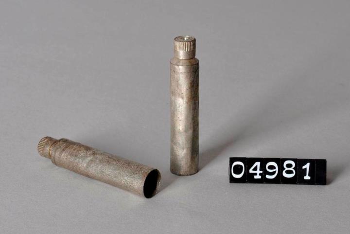 Zylindrischer Körper aus Stanniol (Zinn) mit Zinn-Drehverschluß an der Mündung. Die Befüllung mit Salben erfolgt über das offeneTubenende. Das Tubenende wird anschließend mittels einer Tubenzange verschlossen.
