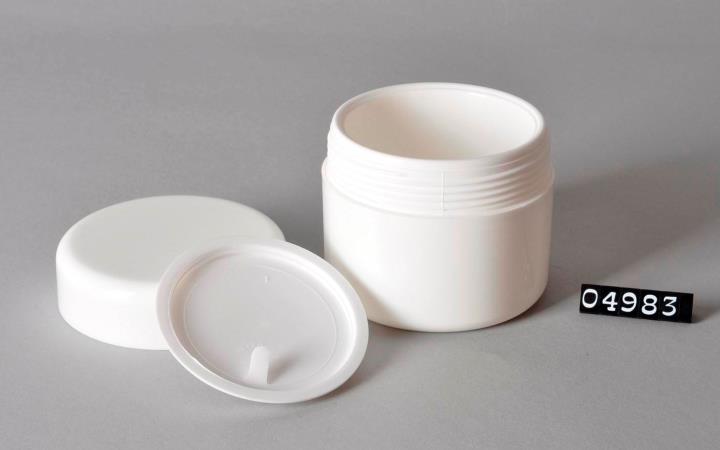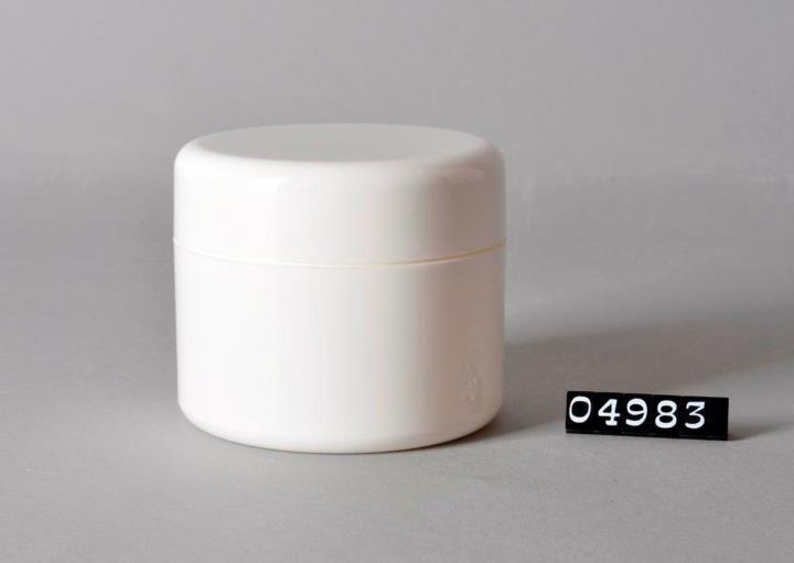 Salbendose aus PP, weiß, doppelwandig. Aufgeschraubter Deckel mit abgerundetem Rand und Dichteinlage aus PE. Boden mit Standring. Hergestellt von der Firma Vetrocap in Mailand. Wurde für die Kosmetiklinie der Stadtapotheke Brixen verwendet.