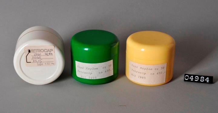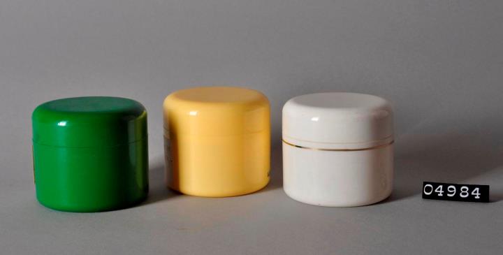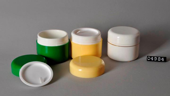 Mustersalbendose weiß mit Goldrand, grün und beige, doppelwandig aus Moplen (PP-H). Aufgeschraubter Deckel mit abgerundetem Rand und Dichteinlage. Boden mit Standring. Hergestellt von der Firma Vetrocap in Mailand.