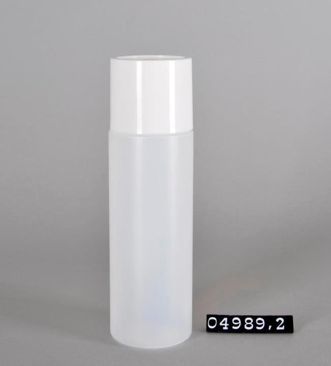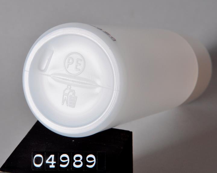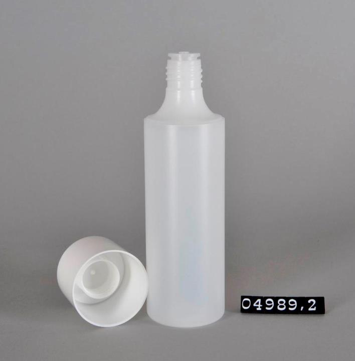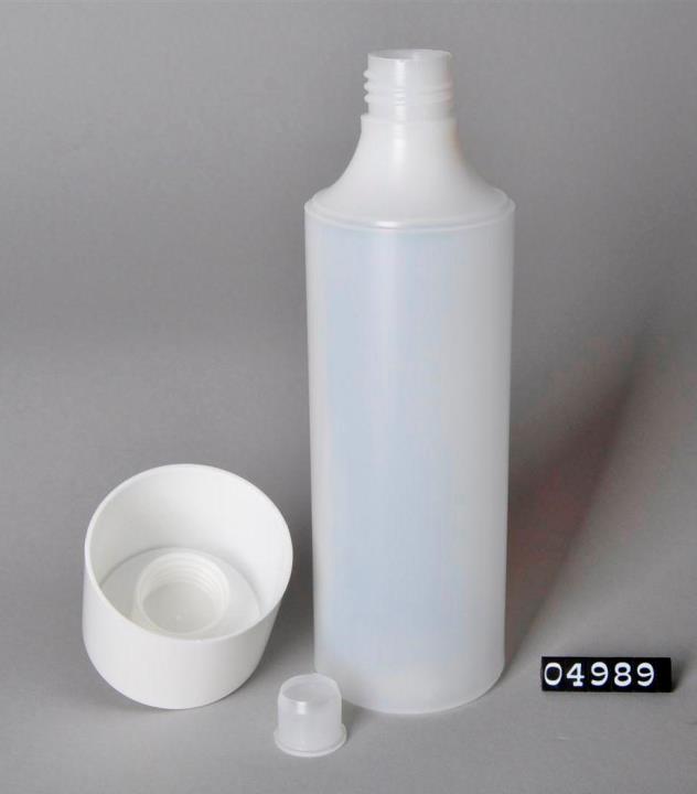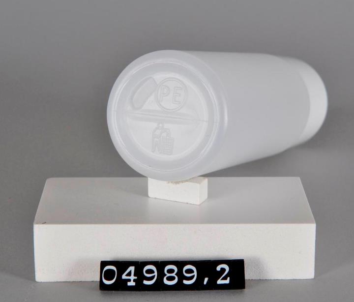 Zylinderförmige Flasche, milchig weiß, aus PE. Ausguss mit Spritzeinsatz zum Stecken. Seitennaht. Weiße Kappe mit innenliegendem Schraubverschluss. Boden leicht nach innen gewölbt mit aufgeprägtem Code für PE und Abfallzeichen (Tidyman) als Aufforderung zur umweltgerechten Entsorgung.