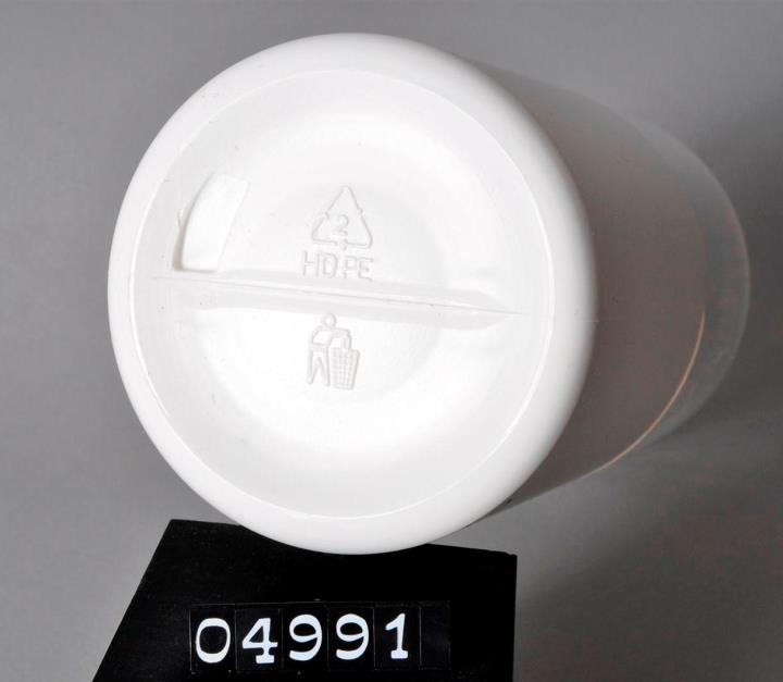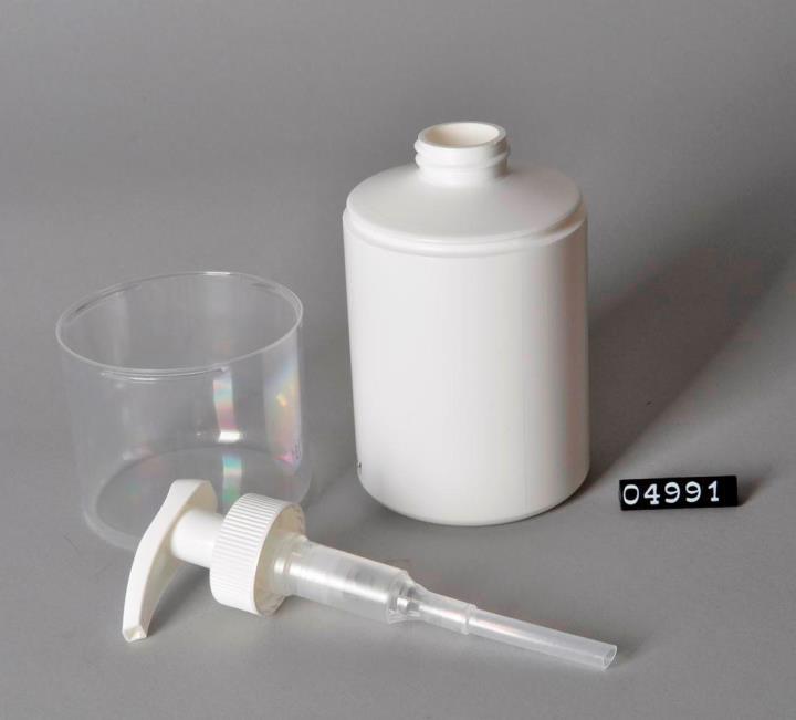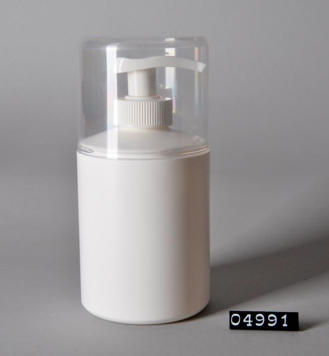 Zylinderförmige Flasche, weiß, aus HDPE mit Lotio-Pumpe zur Aufbewahrung und Abgabe von dünnflüssigen, viskosen Medien. Seitennaht. Farblose, transparente Kappe zum Aufstecken. Boden leicht nach innen gewölbt mit aufgeprägtem Code für HDPE und Abfallzeichen (Tidyman) als Aufforderung zur umweltgerechten Entsorgung.