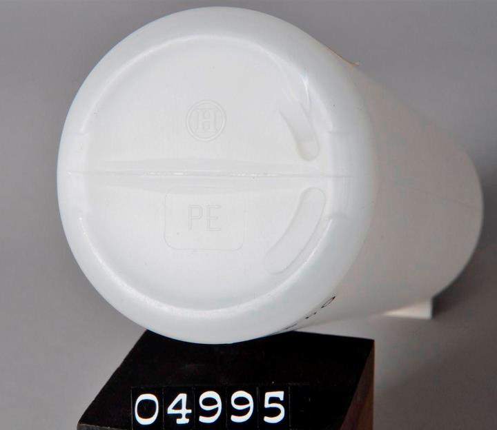 Musterpackung ohne Inhalt: Zylinderförmige Kunststoffflasche aus PE mit Zerstäuber; milchigweiß. Abgeflache Schulter und Seitennaht. Zerstäuberpumpe weiß/gerillt bestehend aus Schraubkörper mit Pumpe, Steigrohr und transparenter Schutzkappe. Bodenprägung "H" und "PE".