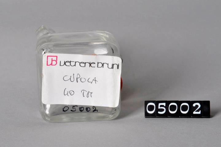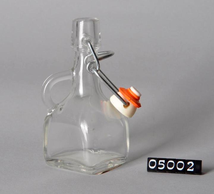 Farblose, am Boden rechteckige Flasche mit Drahtbügelverschluss aus Metall und Kunststoff. Hohe Schulter übergehend in langem, runden Hals. Schulterständiger, aufgesetzter Henkel.