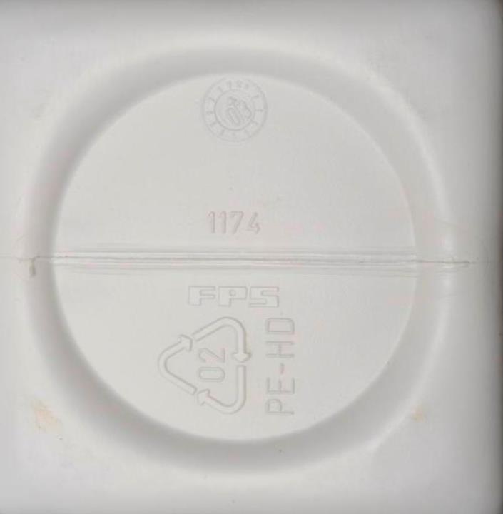 Rechteckiges Weithalsgefäß aus weißem Kunststoff (HDPE) mit seitlicher Naht, Wand leicht eingekerbt für Etikette. Roter, seitlich geriffelter, Schraubdeckel. Aufgebrochener Sicherheitsverschluß. Diente als Verpackung der Produkte der Firma Caelo. 2500ml, 1500ml und 50ml Gefäß