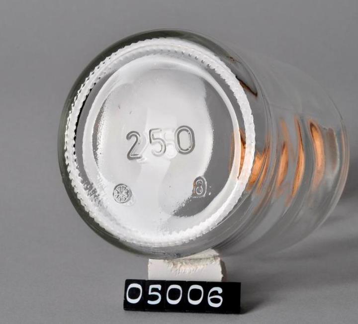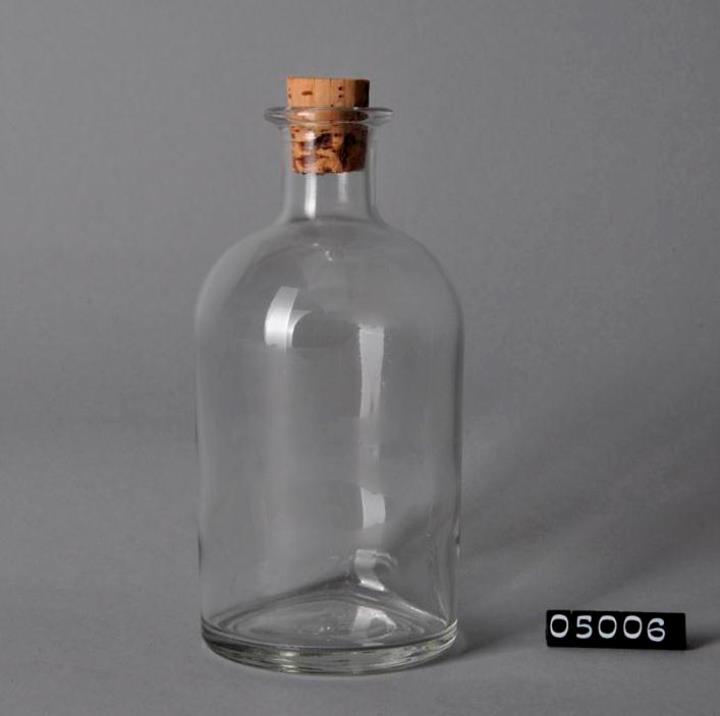Farblose, zylinderförmige Glasflasche mit runder Schulter und ausladendem Mündungsrand. Seitennaht. Boden leicht nach innen gewölbt mit Prägungen (Volumen, Sonnenrad und 8). Bodenrand geriffelt. Mit Kork verschlossen.