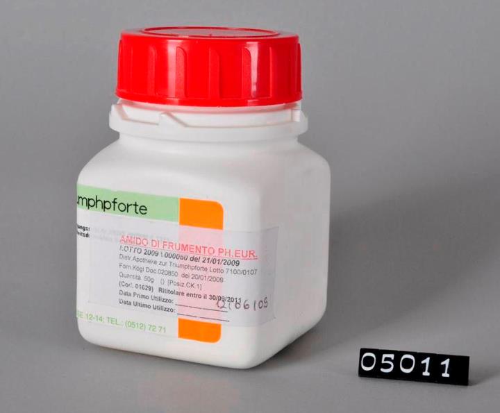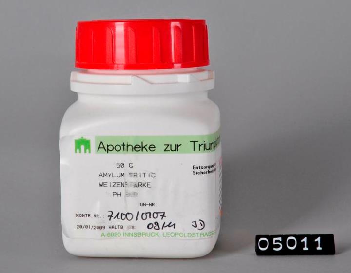 Weißer, im Grundriss quadratischer Weithals-Kunststoffbehälter aus Polyethylen (PE) mit rotem Schraubverschluss aus PP, aufgebrochener Sicherheitsring. Inhalt teilweise entnommen. Etikett der Apotheke zur Triumphpforte. Freigabedatum 20.01.2009. Haltbar bis: 09/2011. Seitlich Chargenetikett der Stadtapotheke Peer.