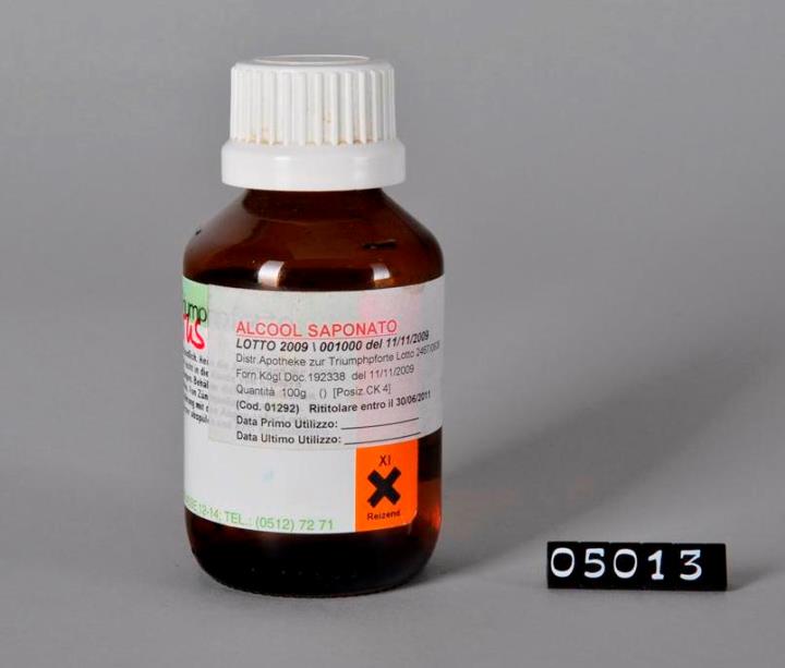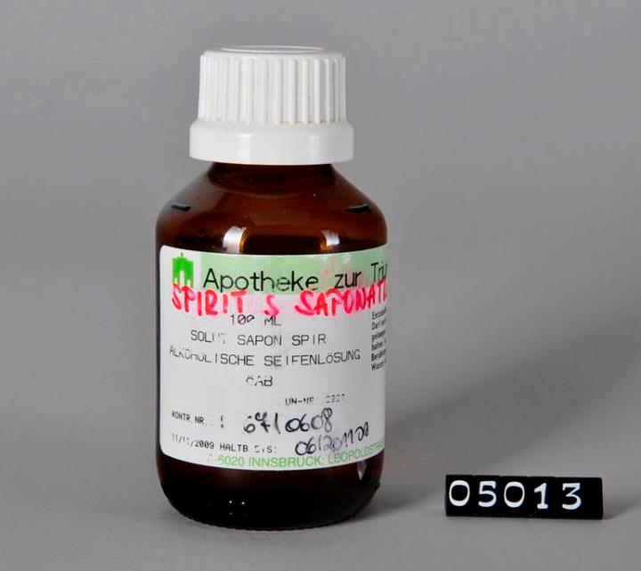 Braune, runde Glasflasche mit weißem geriffeltem Schraubdeckel. Mündung mit Gießring. Zusätzlich rot signiert von Apothekerin Lioba Sperber. Etikett der Apotheke zur Triumphpforte, Innsbruck. Chargenschild der Stadtapotheke Peer vom 11/11/2009. Ca. zu einem Drittel gefüllt.