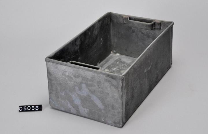 Rechteckiger, grauer Einsatz aus festerem Blech, Oberkante gefalzt, Seitenteile angelötet. Ohne Deckel. Innen an der kurzen Seite zwei angelötete Handgriffe. Dieser Einsatz diente für eine Schublade der Einrichtung aus dem Jahre 1912. Die Blecheinsätze wurden für fettige, stark riechende und pulvrige Substanzen verwendet.