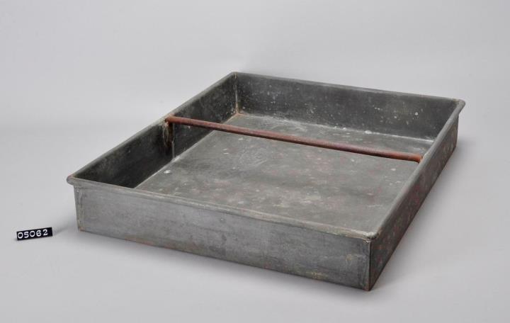 Fast quadratischer, grauer Einsatz aus festerem Blech, Oberkante gerundet, Ecken gelötet. Mittig angelöteter runder Haltegriff aus Eisen. Ohne Deckel. Dieser Einsatz diente für die Aufbewahrung und Transport der Spateln. Höchstwahrscheinlich mit der Einrichtung aus dem Jahre 1912 angekauft.