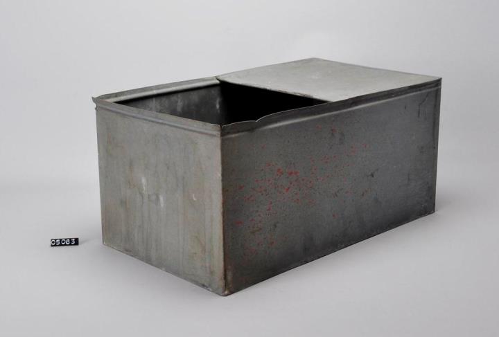 Rechteckiger, grauer Einsatz aus dünnerem Blech. Seitenteile aus einem Stück und leicht überlappend gelötet, Boden angelötet. Oberseite hälftig mit angelötetem Deckel. Der zur Hälte angelötete Scharnierdeckel ist abgebrochen und verloren gegangen. Die Lötreste davon sind sichtbar. Oberkante mit Falz zur Verstärkung. Höchstwahrscheinlich mit der Einrichtung aus dem Jahre 1912 angekauft.