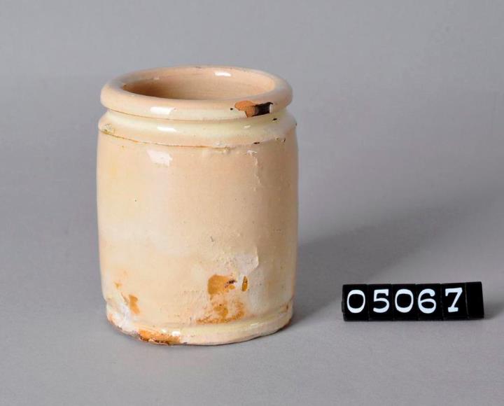 Zylinderförmige, beige Salbenkruke (Salbendose) aus Irdengut mit Binderand und Bodenplatte. Außen und innen glasiert. Boden unglasiert mit Glasurresten. Am Mündugsrand an einer Stelle Glasur abgesprungen.