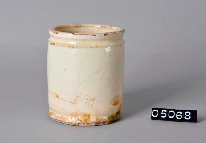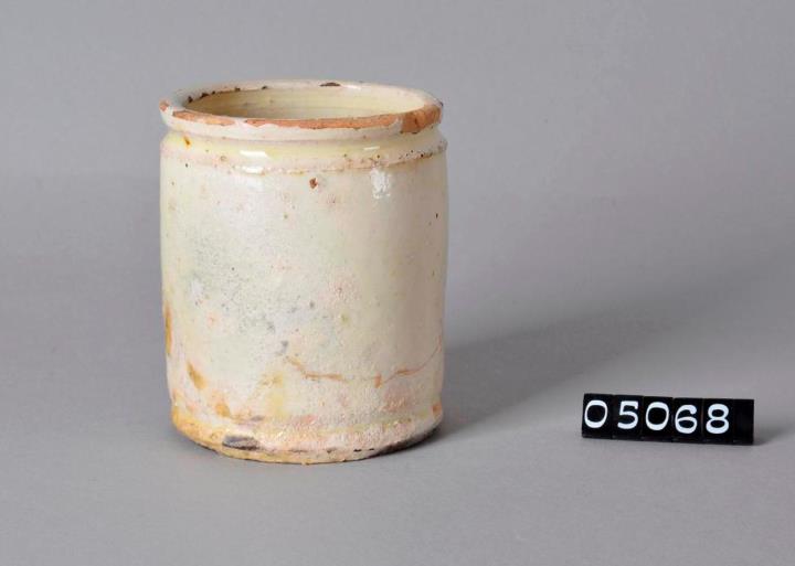Zylinderförmige, beige Salbenkruke (Salbendose) aus Irdengut mit Binderand und Bodenplatte. Außen und innen glasiert. Außen teilweise rauh. Boden unglasiert jedoch mit Glasurresten. Am Mündungsrand an mehreren Stellen Glasur abgplatzt.
