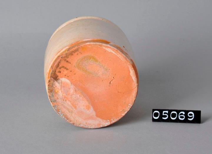 Zylinderförmige, beige Salbenkruke (Salbendose) aus Irdengut mit Binderand und Bodenplatte. Außen und innen glasiert. Rotbraune Flecken. Außen rauh. Boden unglasiert jedoch mit Glasurresten. Roter Scherben. Am Mündungsrand an mehreren Stellen Glasur abgplatzt.