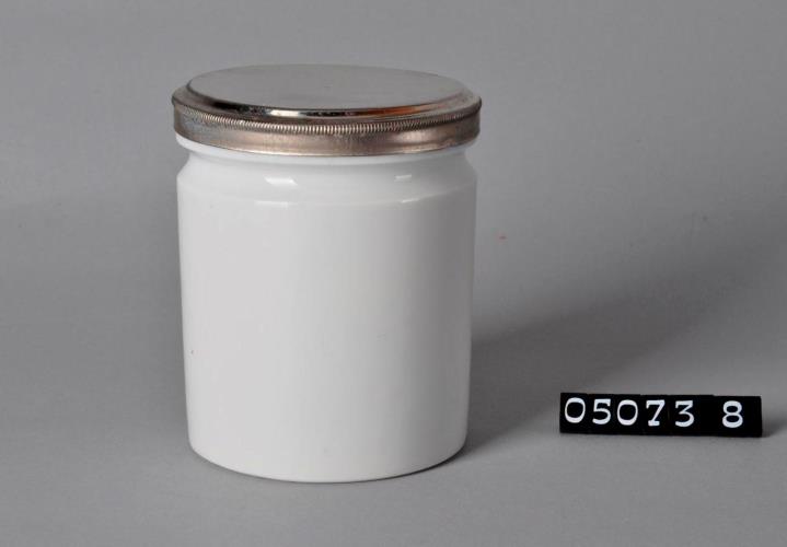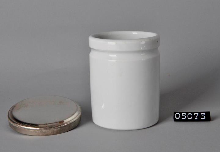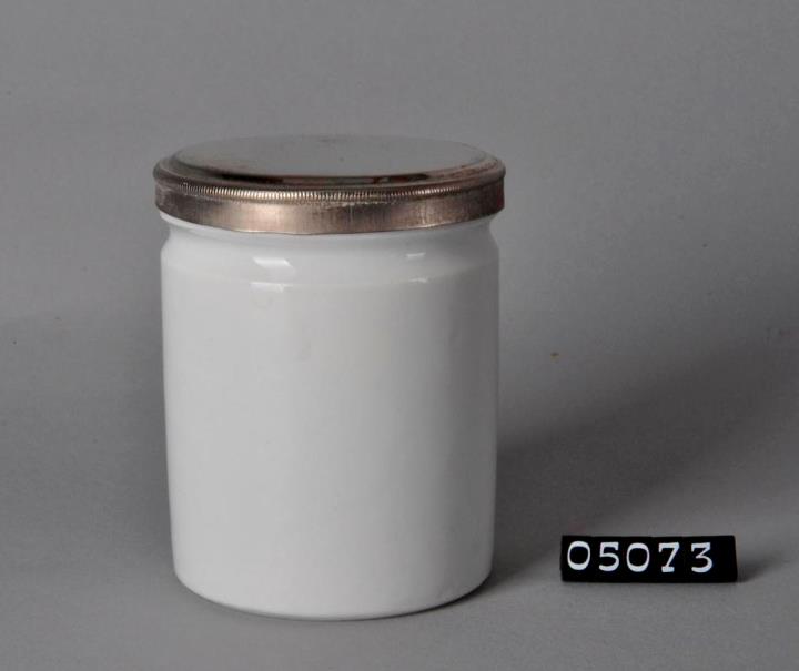 Zylindrische, weiße Salbenkruke (Salbendose) aus Steinzeug mit Binderand und leicht aufgewölbtem Standboden. Boden rauh. Heller Scherben. Acht Kruken, davon eine mit Bodenprägung und vier mit, an der Oberkante geriffeltem, Metallstülpdeckel.