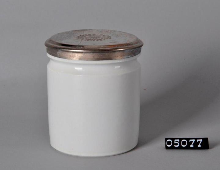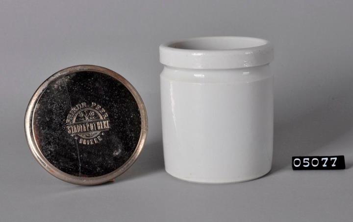 Zylindrische, innen und außen weiß glasierte Salbenkruke (Salbendose) aus Porzellan mit Binderand. Leicht aufgewölbter rauher Boden ohne Standring. Mit Bodenprägung (200). Alle sieben Kruken mit Metallstülpdeckel. Silbriger Blechdeckel mit Logoprägung der Stadtapotheke des Friedrich Peer.