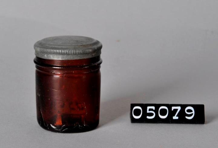 Leicht konische Salbenkruke (Salbendose) aus braunem Glas mit Stülpdeckelrand. Eingewölbter Boden mit Standring und Bodenprägung (10). Beide Kruken mit, am oberen Rand geriffeltem, Blechstülpdeckel.