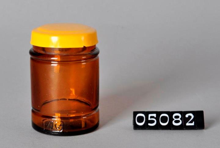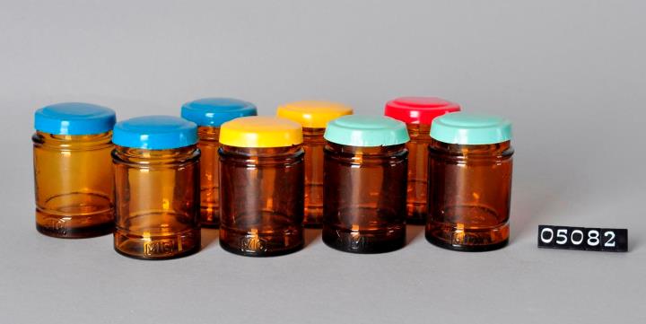 Zylindrische Salbenkruke (Salbendose) aus braunem Glas mit Stülpdeckelrand. Eingewölbter Boden mit Standring und Bodenprägung (20). Mündungsrand geschliffen. Prägung am unteren Rand zwischen Boden und Ring: VIG in einem Bogen. Alle acht Kruken mit farbigem Stülpdeckel aus Celluloid, davon drei mit blauem, zwei mit lindgrünem, zwei mit gelbem und eine mit rotem Deckel.