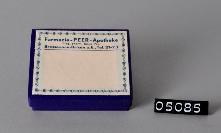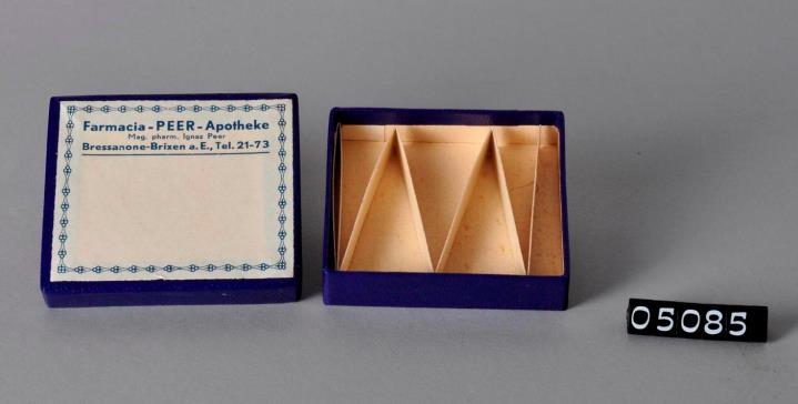 Rechteckige Kästchen aus Karton mit Stülpdeckel zur Verpackung und Abgabe von sechs Zäpfchen. Beiger Karton mit dunkelblauer Elefantenhaut überzogen. Auf dem Deckel weiße Etikette mit blauem Dekorahmen und Firmeneindruck. Innen leporelloartiger Einsatz um die getrennte Lagerung der Zäpfchen zu garantieren.