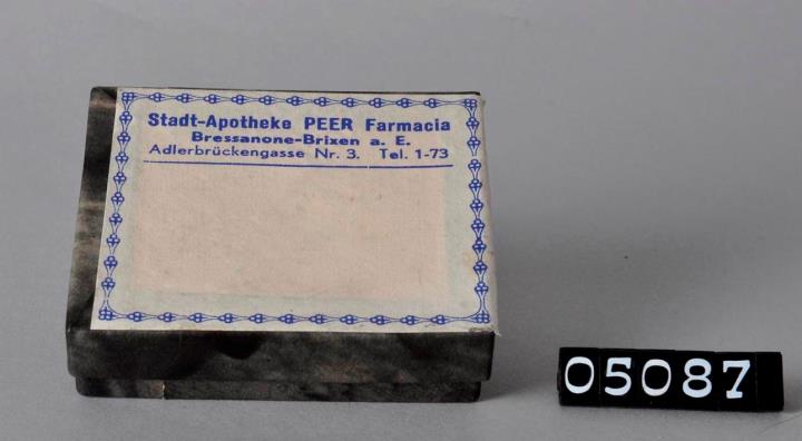 Rechteckige Kästchen aus Karton mit Stülpdeckel zur Verpackung und Abgabe von sechs Zäpfchen. Beiger Karton mit schwarz marmoriertem Papier überzogen. Auf dem Deckel weiße Etikette mit blauem Dekorahmen und Firmeneindruck. Innen leporelloartiger Einsatz um die getrennte Lagerung der sechs Zäpfchen zu garantieren.