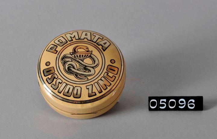Dreifarbig bedruckte, runde Dose aus Weißblech für Zink-Salbe. Nach oben gewölbter und bedruckter Stülpdeckel . Unterseite mit breitem Standring und eingewölbtem Boden. Grundfarbe außen braun-beige. Salbenname und Aeskulapschlange mit Kelch golden mit schwarzem Schatten aufgedruckt. Salbe , meist auf Vaselinbasis, wurde warm eingegossen.