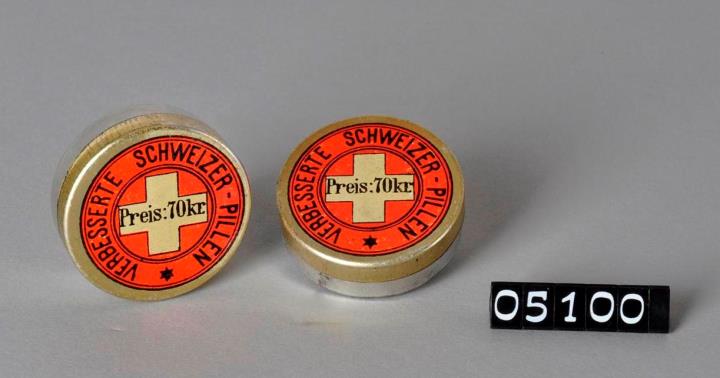 Dreifarbig bedruckte, runde Dose aus Weißblech für Schweizer Pillen. Bedruckter Stülpdeckel. Unterteil der Dose glatt und unbedruckt.. Deckel außen goldfarben, mittig weißes Kreuz mit Preisangabe und ringförmig angebrachete schwarze Schrift, umrahmt von schwarzem Doppelrand.