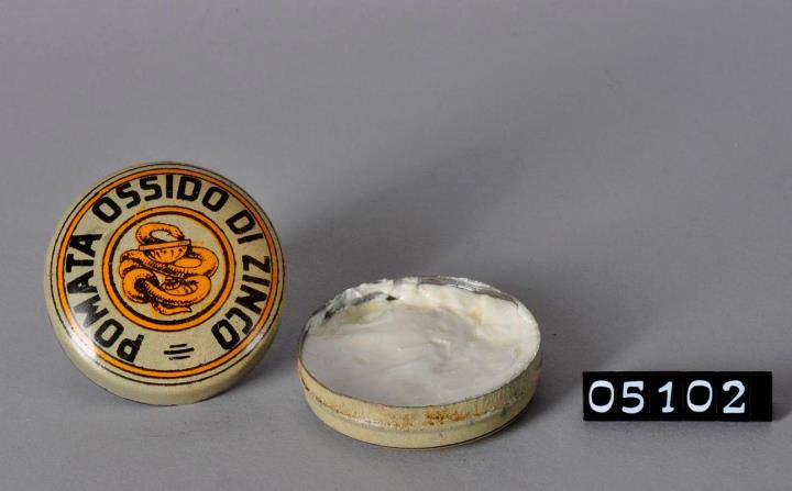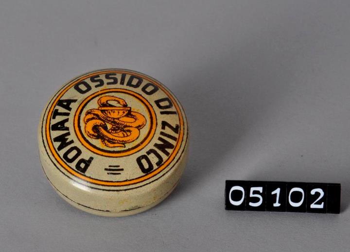 Dreifarbig bedruckte, runde Dose aus Weißblech für Zinksalbe. Nach oben gewölbter und bedruckter Stülpdeckel . Boden mit breitem Standring. Grundfarbe außen des Ober- und Unterteiles der Dose beige. Salbenname entlang der Oberseite des Deckels schwarz aufgedruckt. Dunkelgelbe Aeskulapschlange mit Kelch in rundem gelb-schwarzen Doppelrahmen.