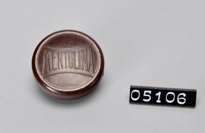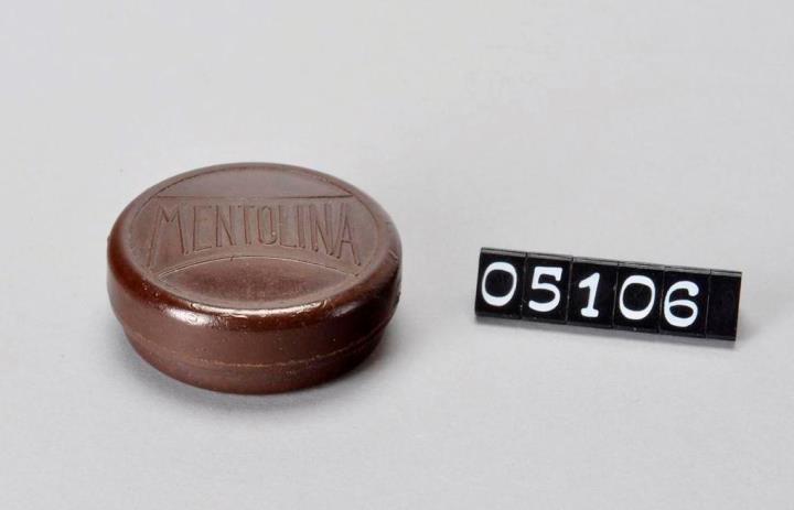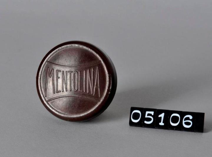 Runde Dose mit Schraubdeckel aus Bakelit für Mentolina. Boden eingewölbt mit breitem Standring. Auf der Oberseite aufgeprägter Produktnamen. Mentolina ist ein Schnupfpulver auf Mentholbasis.