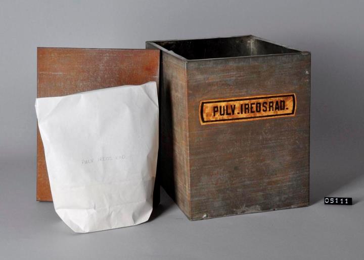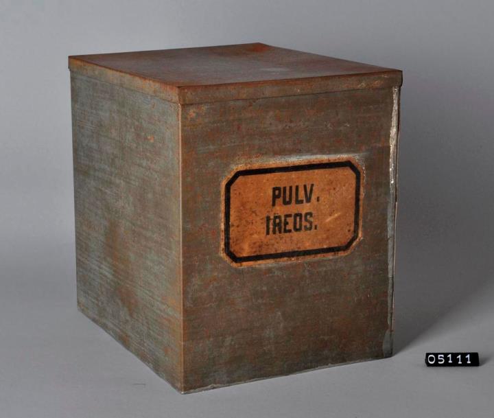 In der Grundfläche rechteckige Blechdose aus Weißblech mit Stülpdeckel für Veilchenwurzelpulver. Boden und an einer Seitenkante gelötet. Mündungsrand im rechten Winkel umgebogen. Innen und außen mit einigen, wenigen Rostflecken. Mit Originalinhalt. Signiert.