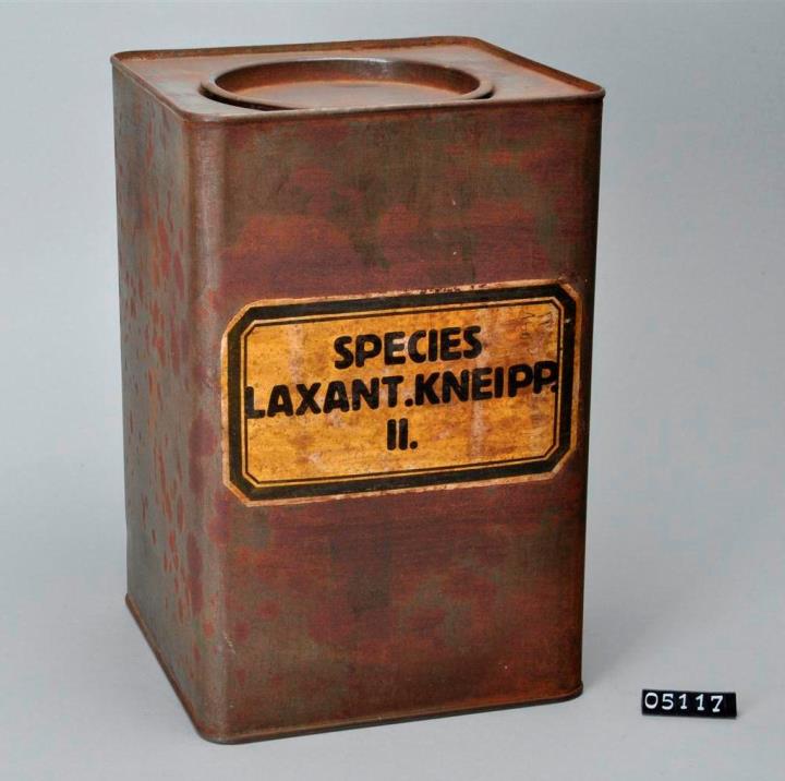 In der Grundfläche quadratische Blechdose aus Weißblech für Abführtee nach Pfarrer Kneipp. Boden mit Standring, gefalzt und geltötet. Seitenwand an der Rückseite verlötet. Deckelrand umgebogen direkt mit Seitenwand verlötet, flacher, runder Einlegedeckel mit Zarge. Signiert.