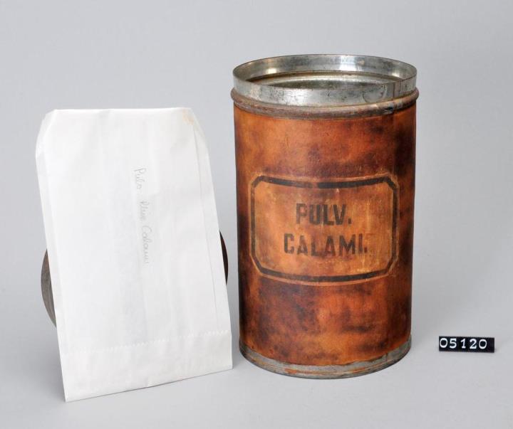 Zylindrische Dose aus Weißblech mit Stülpdeckel für Kalmuswurzelpulver. Boden umgebogen und mit Seitenwand verlötet. Stülpdeckelrand. Längsseite verlötet. Deckelrand umgebogen und mit Zarge verlötet. Seitenwand mit braunem Papier überzogen. Signiert mit ehemals beigen Schild mit schwarzem Rahmen, geschützt mit Etikettenlack. Innenseite Deckel: eingaravierte Preisangabe.