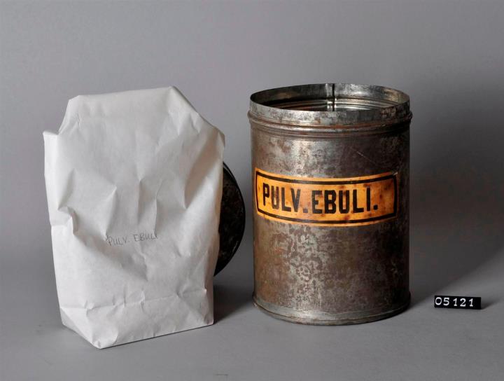 Zylindrische Dose aus Weißblech mit Stülpdeckel für Attichwurzelpulver. Boden umgebogen und mit Seitenwand verlötet. Stülpdeckelrand. Längsseite verlötet. Deckelrand umgebogen und mit Zarge verlötet. Signiert mit ehemals beigen Schild mit schwarzem Rahmen, geschützt mit Etikettenlack.