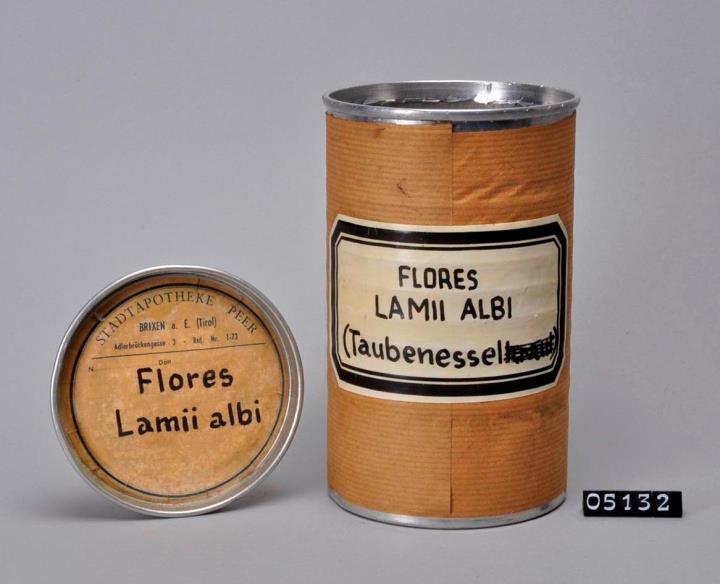 Zylindrische Dose aus Aluminiumblech mit Eindrückdeckel. Ehemals Dose für Guigoz gezuckerte Pulvermilch. Am oberern Dosenrand Manschette als Halterung des Folien-Aufreißdeckels. Innen noch Folienreste sichtbar. Wand mit neun eingedrückten rinnenförmigen Vertiefungen (Sicke). Boden gebördelt, leicht nach oben gewölbt mit Standring. Chargennummer der ursprünglichen Füllung am Boden eingeprägt. Mit braunem Packpapier überzogen und signiert. Deckel mit Etikette der Stadtapotheke Peer. Schild und Etikett mit Etikettenlack überzogen. Beschriftet von Toni Kerer.