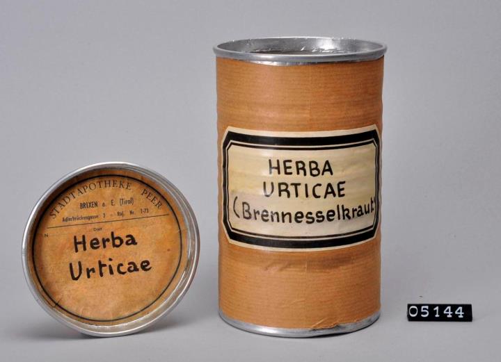 Zylindrische Dose aus Aluminiumblech mit Eindrückdeckel. Ehemals Dose für Guigoz gezuckerte Pulvermilch. Am oberern Dosenrand Manschette als Halterung des Folien-Aufreißdeckels. Innen noch Folienreste sichtbar. Wand mit neun eingedrückten rinnenförmigen Vertiefungen (Sicke). Boden gebördelt, leicht nach oben gewölbt mit Standring. Chargennummer der ursprünglichen Füllung am Boden eingeprägt. Mit braunem Packpapier überzogen und signiert. Deckel mit Etikette der Stadtapotheke Peer. Schild und Etikett mit Etikettenlack überzogen. Beschriftet von Toni Kerer.