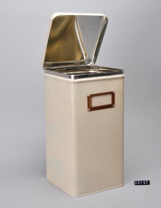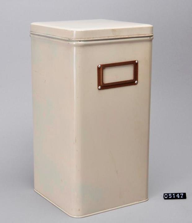 Im Grundriss quadratische Dose aus Weißblech mit Scharnierdeckel und angenietetem Schilderrahmen (68x35mm). Boden gefalzt und mit Standring. Außen elfenbeinfarbig einbrennlackiert.