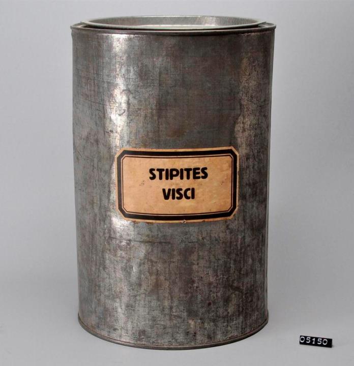 Zylindrische Dose aus Weißblech mit Patentdeckel für Mistelkraut. Boden und Oberseite gefalzt und angesetzt. Längsseite gelötet. Boden mit Standring. Patentdeckel aus einem Stück gestanzt, mit umgebogenem Rand. Signiert.