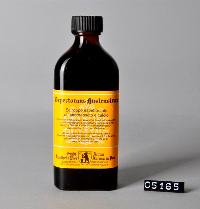 Univi- Vierkantflasche, in der Grundfläche rechteckiger Querschnitt aus braunem Glas, abfallende Schulter und schwarzer geriffelter Schraubverschluss für Expectorans Hustensaft. Eigenpräparat der Stadtapotheke Peer. Etikettiert mit gelben Etikett. Hintergrund stilisierte Pflanze mitRahmen in Negativdruck. Rückseite Preisschild mit Chargennummer und Herstellungsdatum (12/1984).