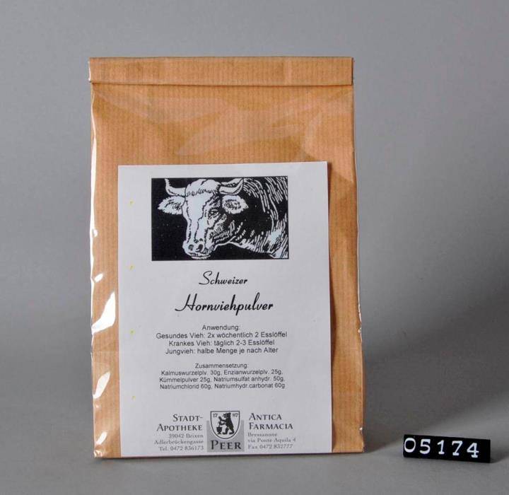 Brauner 2-lagiger Blockbodenbeutel mit 2 Seitenfalten und einem festen Bodenblatt, bestehend aus braunem, ungebleichtem Kraftpapier und außen Cellophan (Polypropylen, transparent) für Schweizer Hornviehpulver. Zwischen den beiden Lagen des Stehbodensackes eingeschobenes Etikett mit Produktnamen und Gebrauchsanleitung. Mündung gefalzt und verschlossen mit einem ca 13cm langen Verschlussstreifen aus weißem, mit Draht verstärktem Papier. Am Boden selbstklebendes Schild mit Herstellungsdatum, Chargennummer, Aufbrauchfrist, Preis und Barcode.