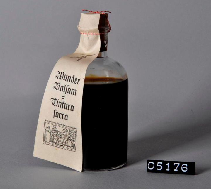 Runde, farblose Glasflasche mit Korkstopfen. Standring geriffelt, Boden leicht eingewölbt mit Sonnensymbol als Prägung. Mündung ausgebogen. Runde Schulter. Seitennaht. Beschriftung mittels Rezeptfahne. Enthält Tinctura Aloes composta (Med Ed VI)