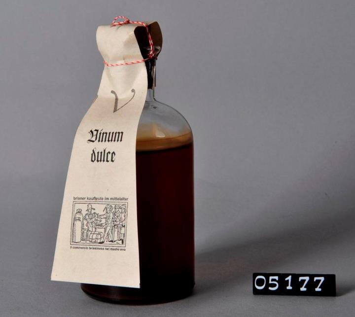 Runde, farblose Glasflasche mit Korkstopfen. Standring geriffelt, Boden leicht eingewölbt mit Sonnensymbol als Prägung. Mündung ausgebogen. Runde Schulter. Seitennaht. Beschriftung mittels Rezeptfahne. Enthält Marsala