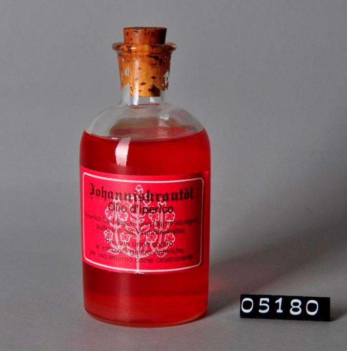 Runde, farblose Glasflasche, mit Bindfaden gesicherter Korkstopfen. Standring geriffelt, Boden leicht eingewölbt mit aufgeprägtem Sonnensymbol. Mündung ausgebogen. Runde Schulter. Seitennaht. Signiert. Enthält Johanniskrautöl.