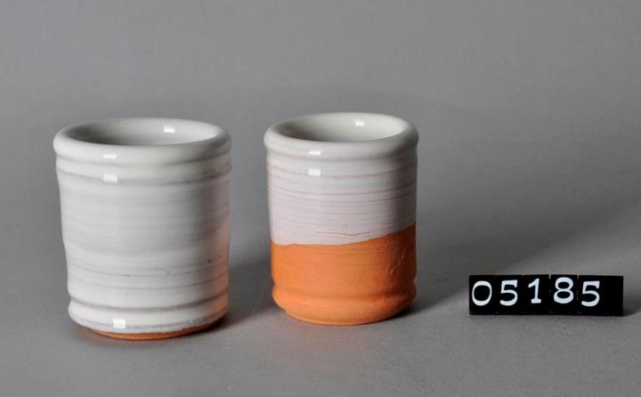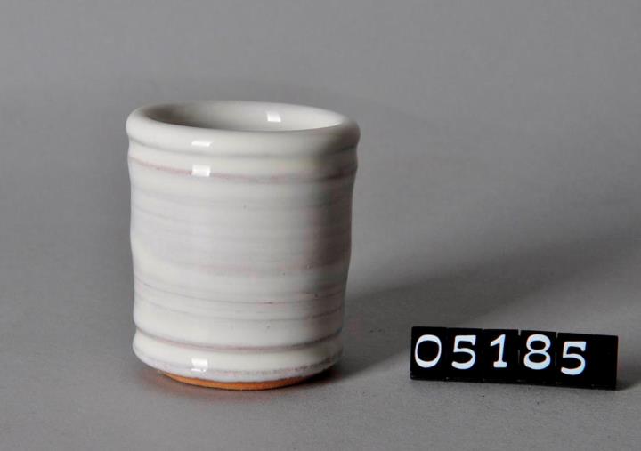 Zylindrische, weiß glasierte Salbenkruke aus Irdenware. Schwacher Binderand. Bodenrille. Boden unglasiert, leicht eingewölbt; roter Scherben. Hergestellt für das Altstadtfest 1994 von Prosch Keramik in Schabs.