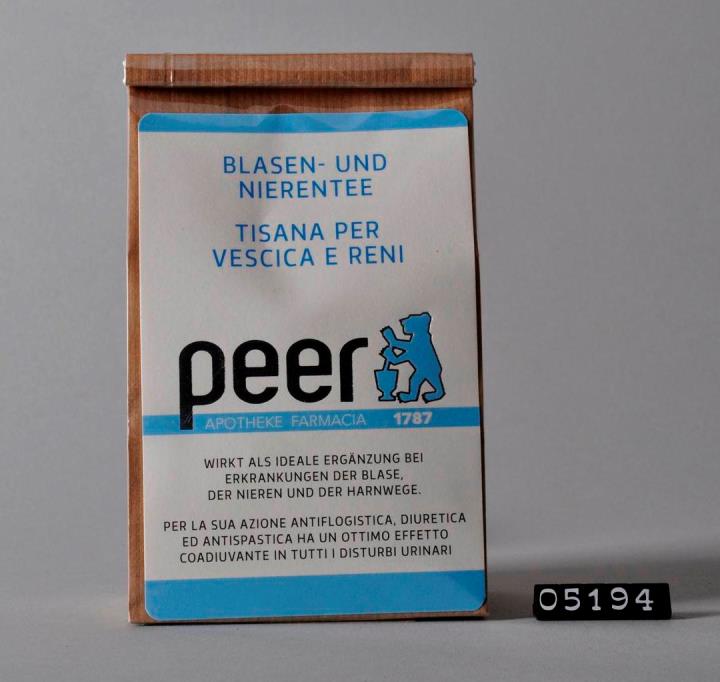 Stehbodensack mit Cellophan: brauner 2-lagiger Blockbodenbeutel mit zwei Seitenfalten und einem festen Bodenblatt, bestehend aus braunem, ungebleichtem Kraftpapier und Cellophan (Polypropylen, transparent) für Kräutermischungen. Befüllt mit Blasen- und Nierentee. Zwischen den beiden Lagen des Säckchens: auf der Vorderseite eingeschobenes Etikett mit Produktnamen, Verwendung, sowie Logo der Peer-Apotheken Brixen und Lana, auf der Rückseite Einschub mit Zusammensetzung, Gebrauchsanleitung und Warnhinweisen. Mündung gefalzt und verschlossen mit einem ca 11 cm langen Verschlussstreifen aus weißem, mit Draht verstärktem Papier. Am Boden selbstklebendes Schild mit Herstellungsdatum, Chargennummer, Aufbrauchfrist, Preis und Barcode.