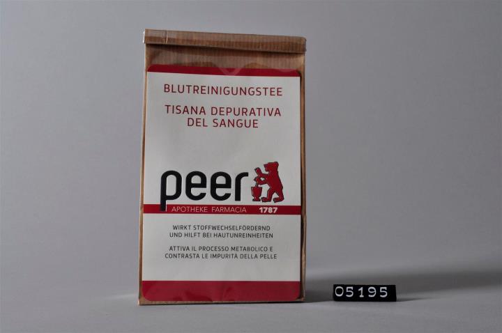 Stehbodensack mit Cellophan: brauner 2-lagiger Blockbodenbeutel mit zwei Seitenfalten und einem festen Bodenblatt, bestehend aus braunem, ungebleichtem Kraftpapier und Cellophan (Polypropylen, transparent) für Kräutermischungen. Befüllt mit Blutreinigungstee. Zwischen den beiden Lagen des Säckchens: auf der Vorderseite eingeschobenes Etikett mit Produktnamen, Verwendung, sowie Logo der Peer-Apotheken Brixen und Lana, auf der Rückseite Einschub mit Zusammensetzung, Gebrauchsanleitung und Warnhinweisen. Mündung gefalzt und verschlossen mit einem ca 11 cm langen Verschlussstreifen aus weißem, mit Draht verstärktem Papier. Am Boden selbstklebendes Schild mit Herstellungsdatum, Chargennummer, Aufbrauchfrist, Preis und Barcode.