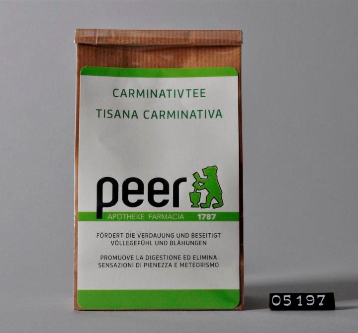 Stehbodensack mit Cellophan: brauner 2-lagiger Blockbodenbeutel mit zwei Seitenfalten und einem festen Bodenblatt, bestehend aus braunem, ungebleichtem Kraftpapier und Cellophan (Polypropylen, transparent) für Kräutermischungen. Befüllt mit Carminativtee. Zwischen den beiden Lagen des Säckchens: auf der Vorderseite eingeschobenes Etikett mit Produktnamen, Verwendung, sowie Logo der Peer-Apotheken Brixen und Lana, auf der Rückseite Einschub mit Zusammensetzung, Gebrauchsanleitung und Warnhinweisen. Mündung gefalzt und verschlossen mit einem ca 11 cm langen Verschlussstreifen aus weißem, mit Draht verstärktem Papier. Am Boden selbstklebendes Schild mit Herstellungsdatum, Chargennummer, Aufbrauchfrist, Preis und Barcode.